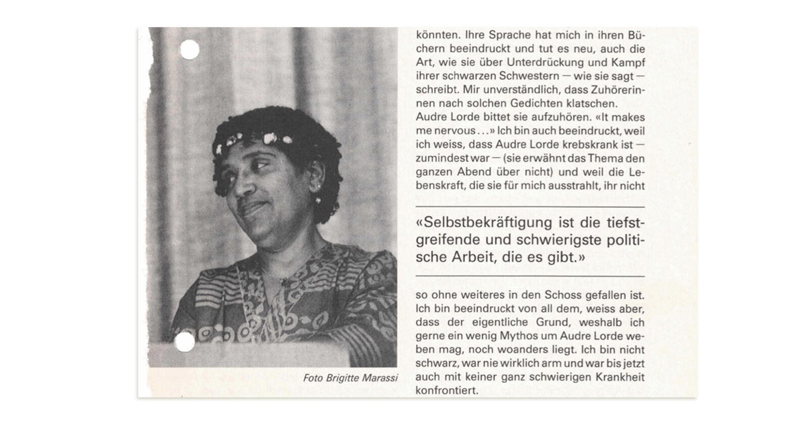 Dass Lorde mit Feministinnen in Zürich zu sehen ist, greift auch eine Realität der 1980er Jahre auf, wie Naegeli schreibt. Schon zum dritten Mal habe Lorde in Zürich gelesen, 1989 auf Einladung der cfd-Frauenstelle für Friedensarbeit. Der «[S]chwarzen, sehr afrikabezogenen» Frau hörten vor allem weisse «Zürcherinnen […] aus der feministisch engagierten Mittelstands-Frauenszene» zu. Konfrontiert mit Lordes dreifacher Unterdrückung reflektiert Naegeli ihre Privilegien und die vielen Facetten des Feminismus.