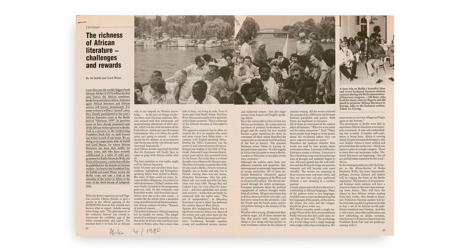 Vor dem Hintergrund des Berliner Festivals «Horizons» von 1979 thematisieren Imfeld und Meuer in ihrem Artikel die Situation der in Frankfurt eingeladenen afrikanischen Gäste. Nach wie vor verhindern oftmals «politische Gründe» die Teilnahme wichtiger Autorinnen und Autoren: Wie sie schreiben, birgt das dritte Jahrzehnt der Unabhängigkeit vielerorts reale Gefahren für Literatinnen und Literaten, weshalb viele von ihnen im Exil wirken oder vorerst verstummen müssen. Am Berliner Symposium konnten sich jedoch diverse Autorinnen und Autoren teilweise zum ersten Mal versammeln und sich austauschen. Viele von ihnen haben dabei auch lautstark ihre Wut bezüglich der Arroganz und Dominanz der westlichen Kultur geäussert. Sie unterstrichen die unabdingbare Verknüpfung von Politik und Poesie: Die Literatur könne die Realität formen, ein Gedicht könne eine neue Realität schaffen. Das in Berlin zum Ausdruck gekommene «neue Selbstverständnis» und die «neuen Ideen» afrikanischer Schriftstellerinnen und Schriftsteller werden dank Übersetzungen erstmals einer deutschsprachigen Leserschaft zugänglich gemacht. Rückblickend hat die Frankfurter Buchmesse von 1980 der Vermittlung und dem Vertrieb afrikanischer Literaturen einen kräftigen Schub gegeben.