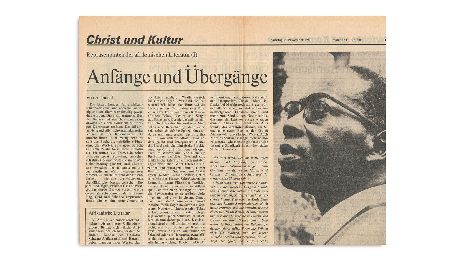 Im Artikel «Anfänge und Übergänge» vom 8. November 1980 spricht Al Imfeld die Fülle und Diversität afrikanischer Literaturen und deren orale Traditionen an. Trotz der vielen Kontraste bildet die Erfahrung des Kolonialismus eine Gemeinsamkeit, die die orale Tradition durch das Aufzwingen der europäischen Sprachen, Werte und der Schrift beeinflusst habe. Eine neue Autorengeneration macht sich dieses «Phänomen des Dazwischenseins» aber zu eigen und «löst neue Visionen […] aus». Unter dem Titel «Beschwörer einer menschlichen Zukunft» präsentiert Al Imfeld in einem zweiten Artikel vom 22. November 1980 eine spätere Generation von Literatinnen und Literaten, die sich angesichts bestehender Probleme eine andere Unabhängigkeit gewünscht hätten.